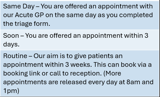 Book an appointment online to see or speak to your GP or other healthcare professional by using our online triage system. Click the link below to use our online triage system. You’ll be able to state the type of appointment you feel you need.